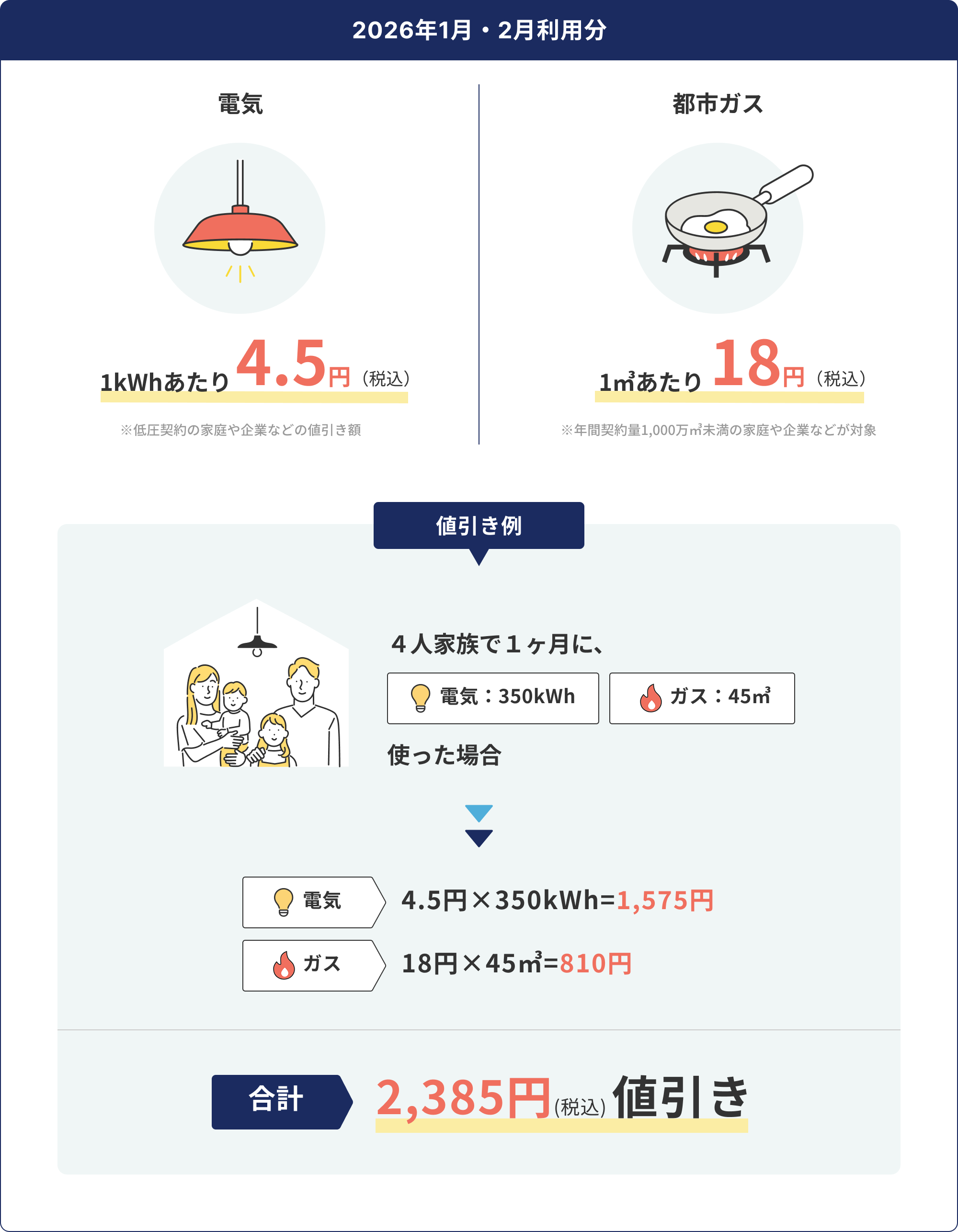 国の「電気・ガス料金負担軽減支援事業補助金」に基づき、2026年1月利用分~2026年3月利用分の電気・ガス料金の値引きを行います。